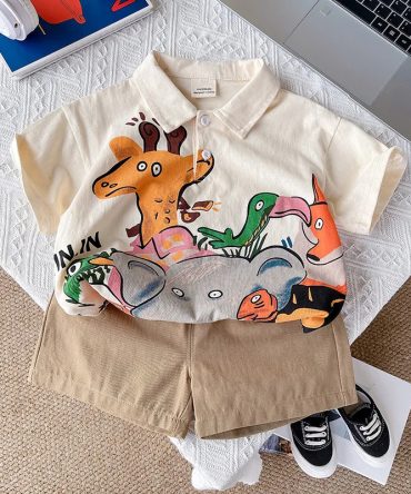Boys Casual Cute Cartoon Animals Print Short Sleeve Lapel Shirt Shorts Sets