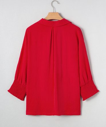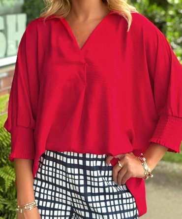 Fiery Red V Neck Collared Shirred 3/4 Sleeve Oversized Tunic Top