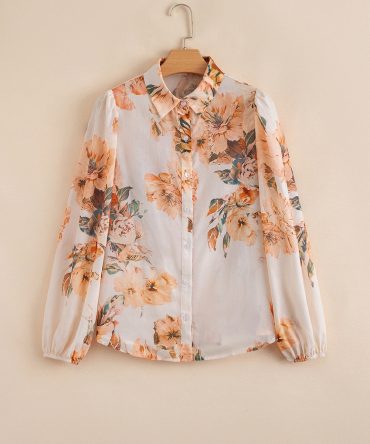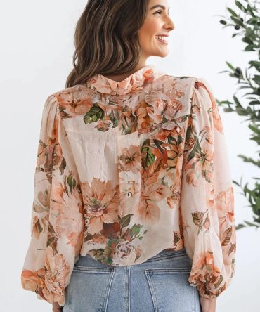 Khaki Botanical Floral Print Split Neck Long Sleeve Blouse