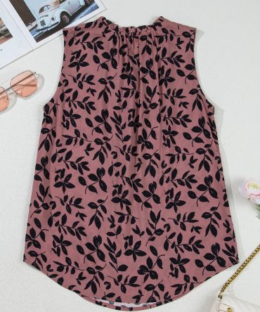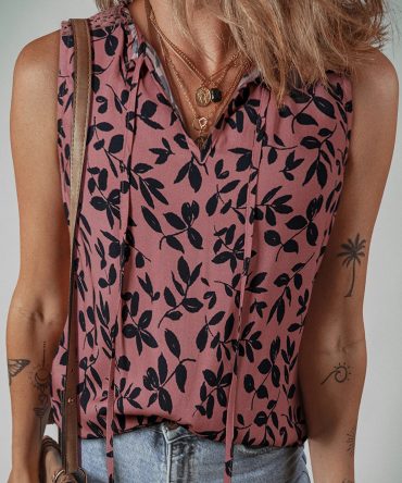 Brown Leaf Print Lace-up V Neck Crinckled Tank Top