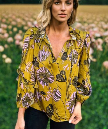 Yellow Vintage Floral V Neck Ruffle Trim Long Sleeve Blouse