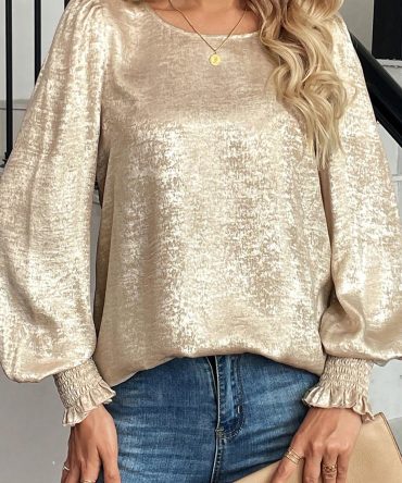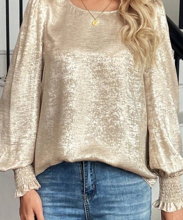 Apricot Metallic Round Neck Smocked Long Sleeve Blouse